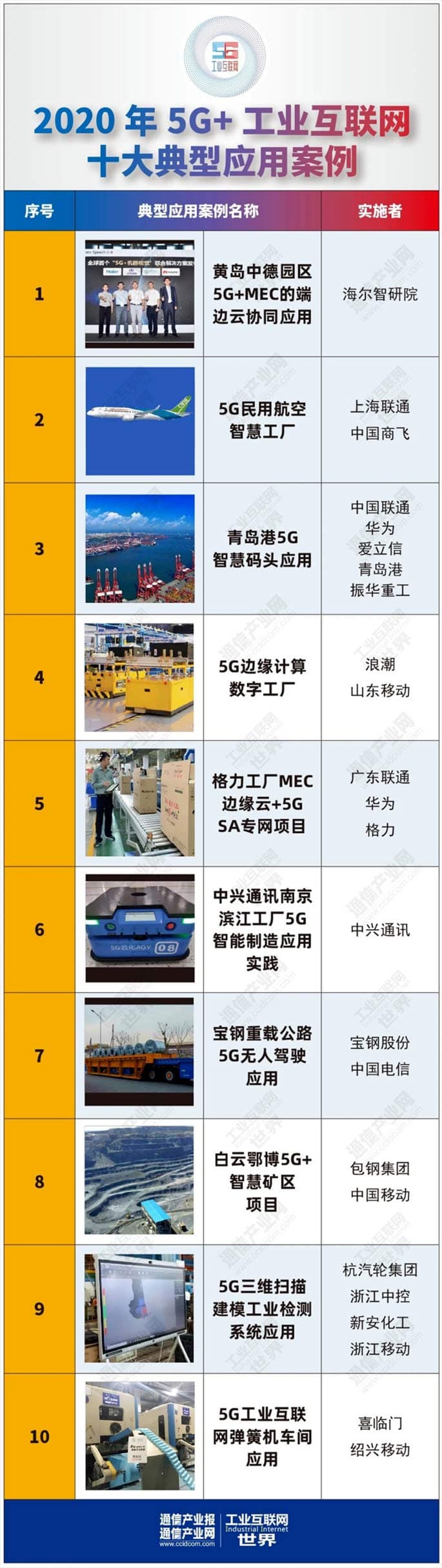 自5G牌照发放以来,围绕5G的应用案例不断涌现,业内一致认为5G未来80%的应用场景将会出现在工业互联网领域,而5G牌照发放已经有一年的 时间,5G在工业互联网和智能制造领域出现了不少极具前瞻性与代表性的5G工业互联网典型应用案例。为此,《工业互联网世界》编辑部与《通信 产业报》全媒体结合企业申报与编辑案例调查,综合评出“2020年5G+工业互联网十大典型应用案例”。