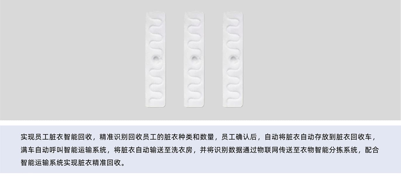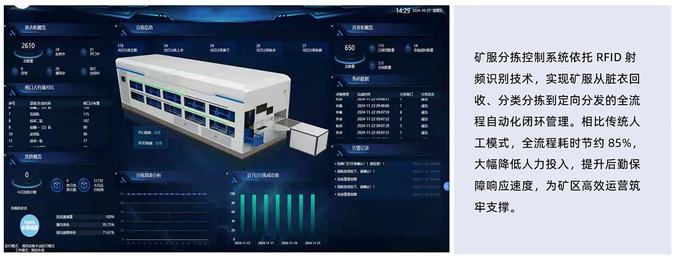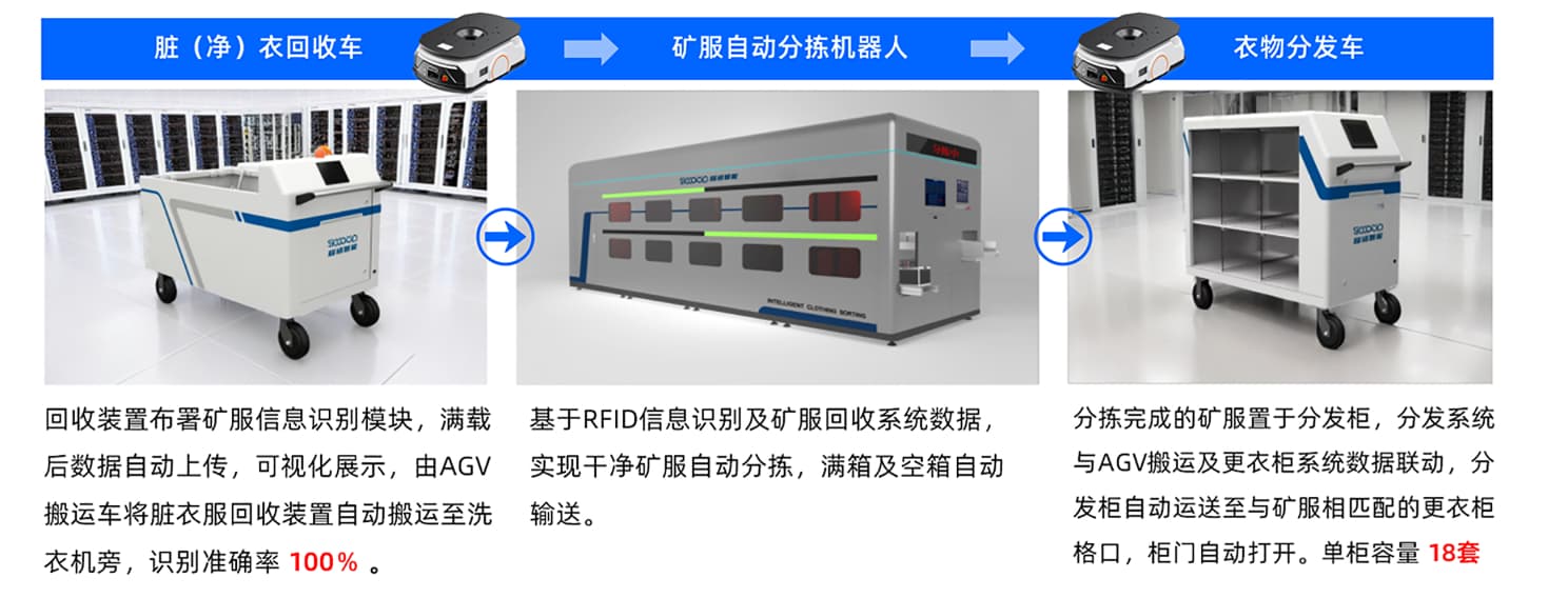 首创矿服RFID标签“一件一码”,在更衣室出口布署智能脏衣回收装置,实现脏衣便捷回收及信息自动识别;在洗衣房布署基于无线射频技术的矿服智能分拣系统,实现净衣自动分拣,分拣完成后置于智能分发柜;通过与AGV智能搬运系统、更衣柜管理系统数据联动,实现净衣配送到更衣柜,具备自动牵引及提醒功能。