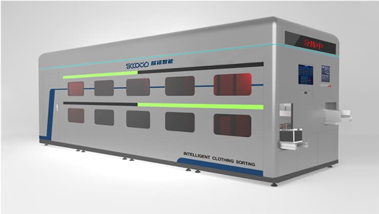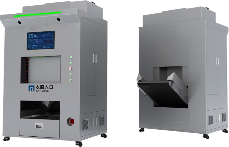 员工投入工服后,设备可自动识别脏衣的种类与数量,经确认后自动收纳至内部的脏衣回收车。当回收车满载时,系统会自动呼叫智能运输系统,将脏衣直接转运至洗衣房,同时将识别数据实时同步至衣物智能分拣系统。