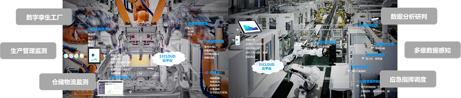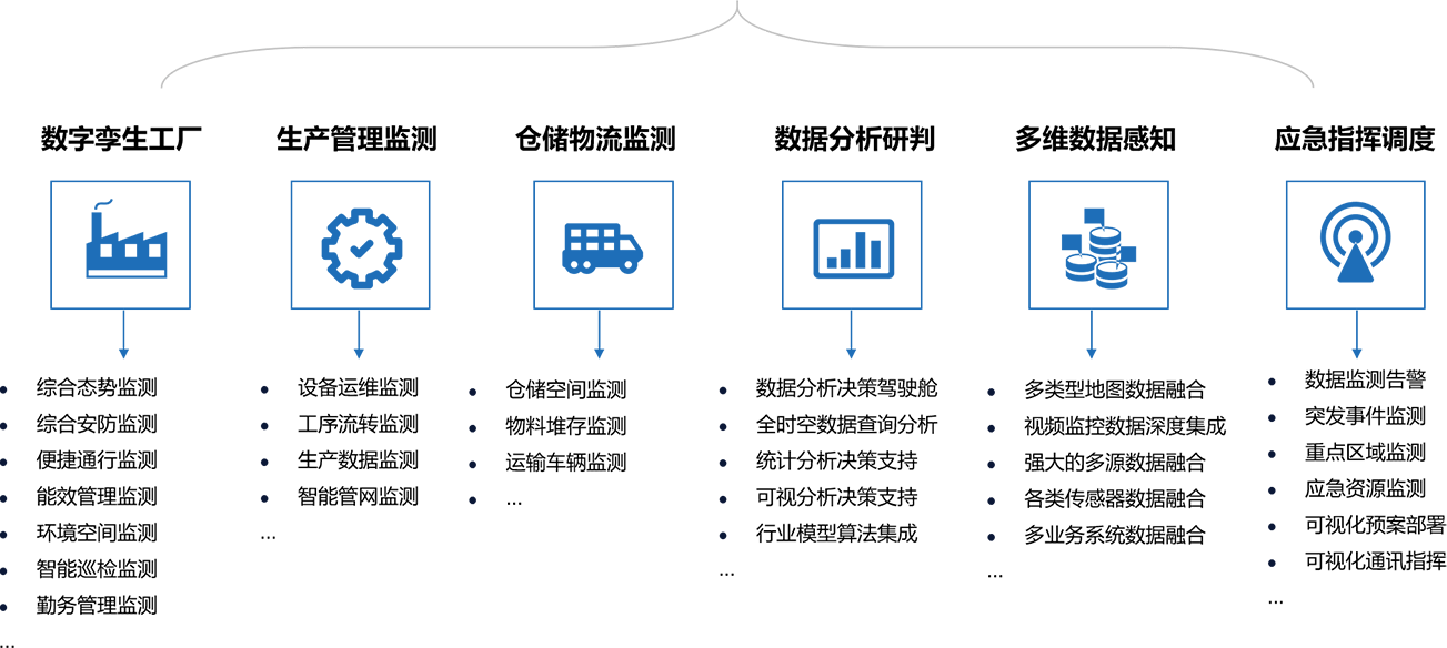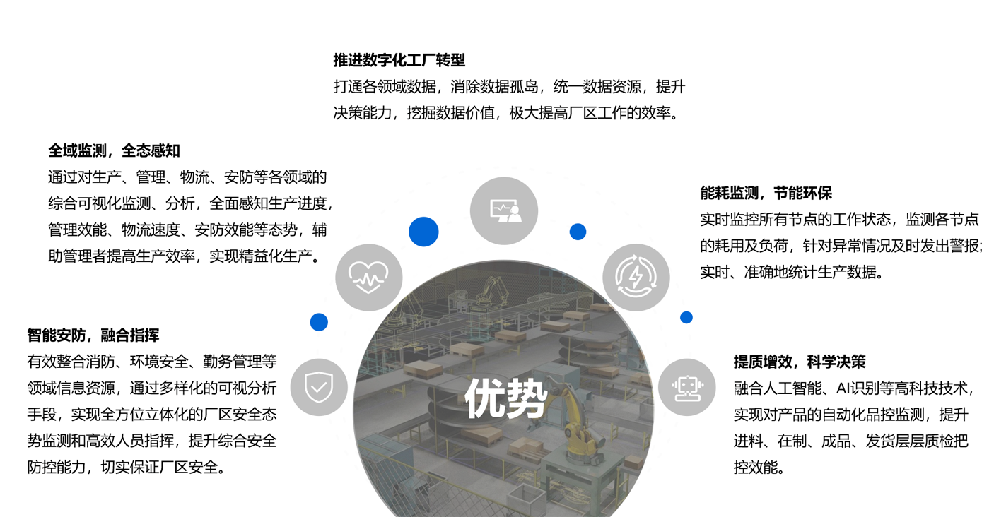 智慧工厂智能系统,支持融合工业大数据、物联网、人工智能等先进技术,整合厂区现有信息系统的数据资源,实现数字孪生工厂、设备运维监测、智能管网监测、综合安防监测、便捷通行监测、 能效管理监测、生产管理监测、仓储物流监测等多种功能,有效提高厂区综合监管能力、降低企业厂区运营成本,实现工厂园区、车间、流水线、设备的逐级可视,并整合各个流程节点之间的数据 及信息对生产过程进行综合监管及全局分析,形成智慧工厂管理的新模式。